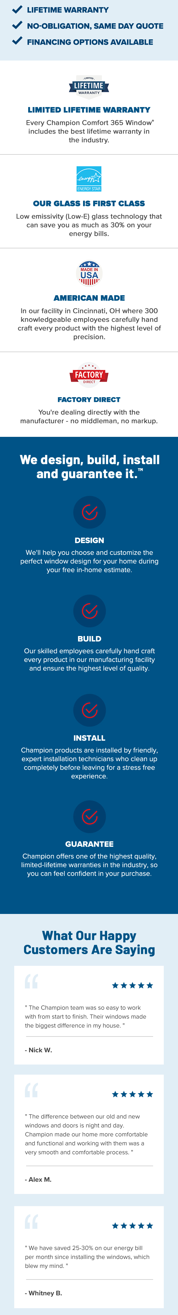Champion offers one of the highest quality, limited-lifetime warranties in the industry, so you can feel confident in your purchase.
